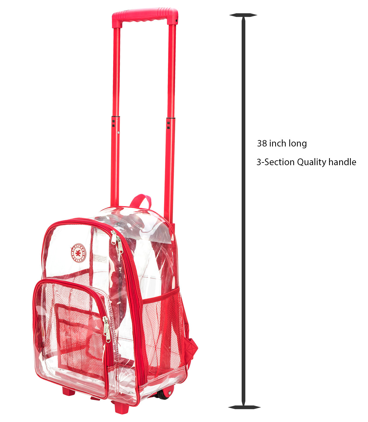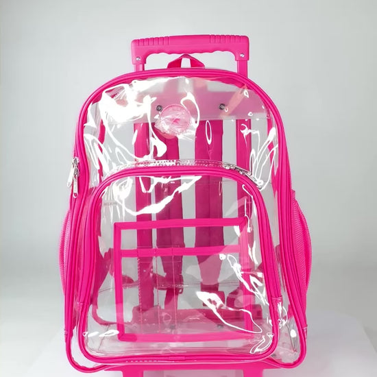 - Spacious and Durable: With Heavily Reinforced shoulder straps, this See-Through Backpack on Wheels offers extra durability for long-lasting use. It's super spacious, providing plenty of room for books and other essentials.