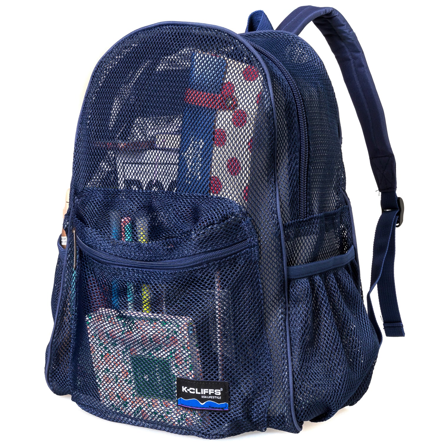 - Classic Mesh Daypack with Adjustable and padded shoulder straps and a handle loop for easy carrying.